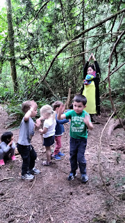 They discovered a special spot that is near our 'Meadow'. It's special, because we haven't had the children play in that spot before. It's a new location for sitting, being still, listening to forest sounds, focusing on breath, watching a spider spin her web, and inhale the sweet smells of Spring.